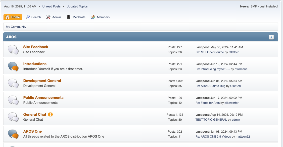 Then we have SMF. It's still maintained with security updates as recent as July 2025. It was already used for the aros-exec 2.0 version, so one less database I need to export to something else new. It's simple to work with, it is a dedicated FORUM CMS and not a CMS that depends on an external module to add the functionality.