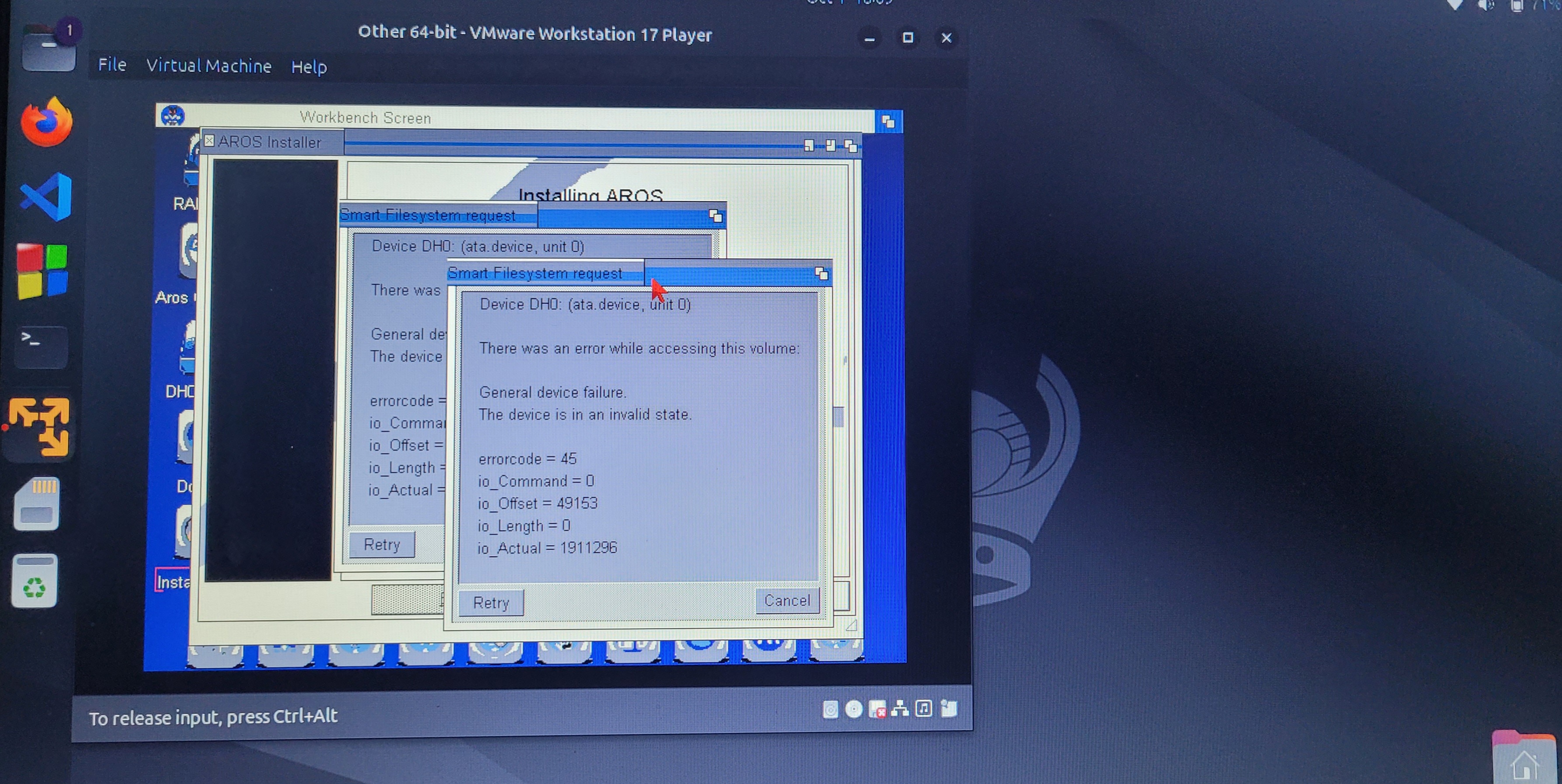 I just download wmware 17.6.4 for ubuntu 24.4, arosone 1.1 just won't install , boots ok but error while installing to vmware virtual drive.