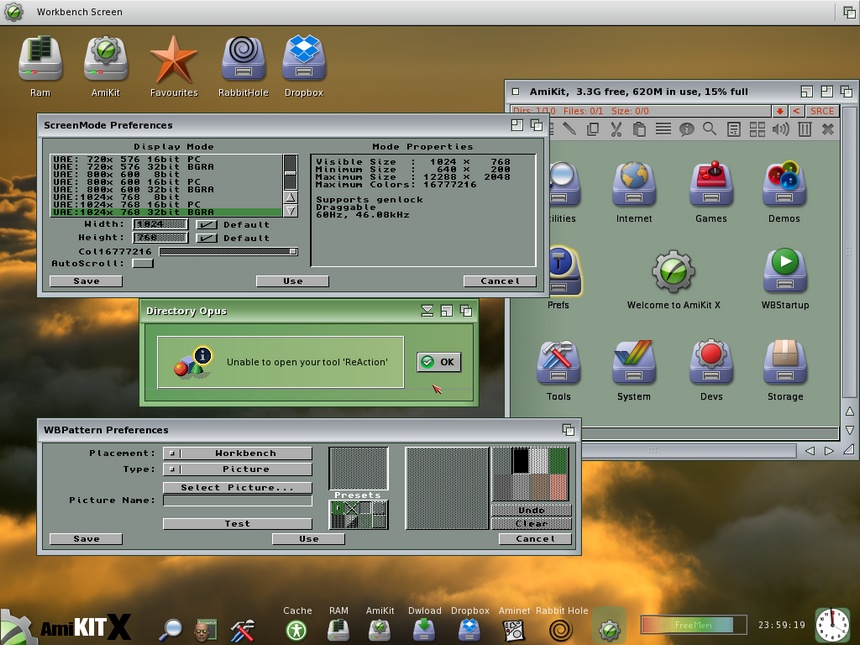 As mentioned with WB 3.1 installed on AmiKit you won't be able to use the OS3.9 based Applications installed because ReAction doesn't work (see screnshot), for example you won't be able to use the text editor set to Dopus4 !